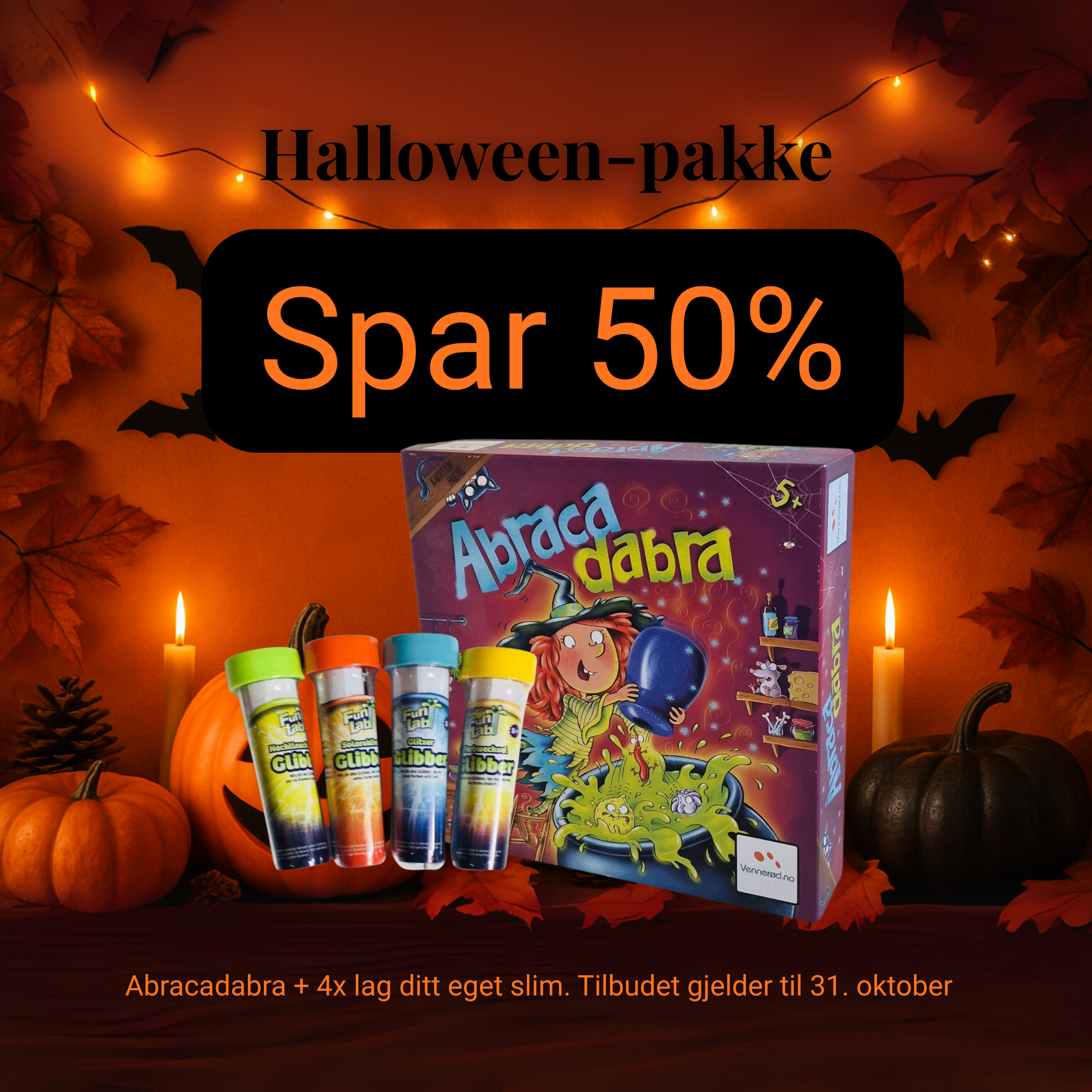 Denne kombinasjonen gir deg det perfekte Halloween-oppsettet! Start kvelden med det spennende heksespillet Abracadabra, og fortsett moroa med kreativ slim-laging. Produktene utfyller hverandre perfekt - først samarbeid og spenning, så kreativ utfoldelse!
